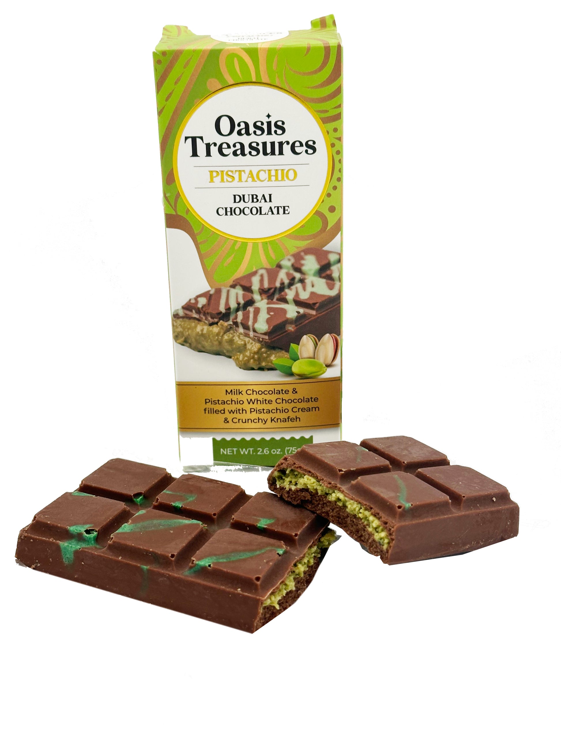 Ingredients: Milk Chocolate (Cocoa butter (20%), cocoa mass (22%), whole milk powder (from cow milk), skimmed milk powder (from cow milk), Emulsifier (soy lecithin E322), vanillin), Shredded Kunafa (Wheat flour, Water, Cornstarch, Canola oil, Sugar, Salt, Wheat starch, Sodium), Pistachio Cream (Vegetable oil from Palm, Sugar, Pistachio (23%), Skim Milk Powder (from cow), Milk Protein (from cow), Emulsifier (Soy Lecithin) E322, food color FD&C Yellow No.5 E102, FD&C Red 40 E129, FD&C Blue no.1 E133), Tahini.